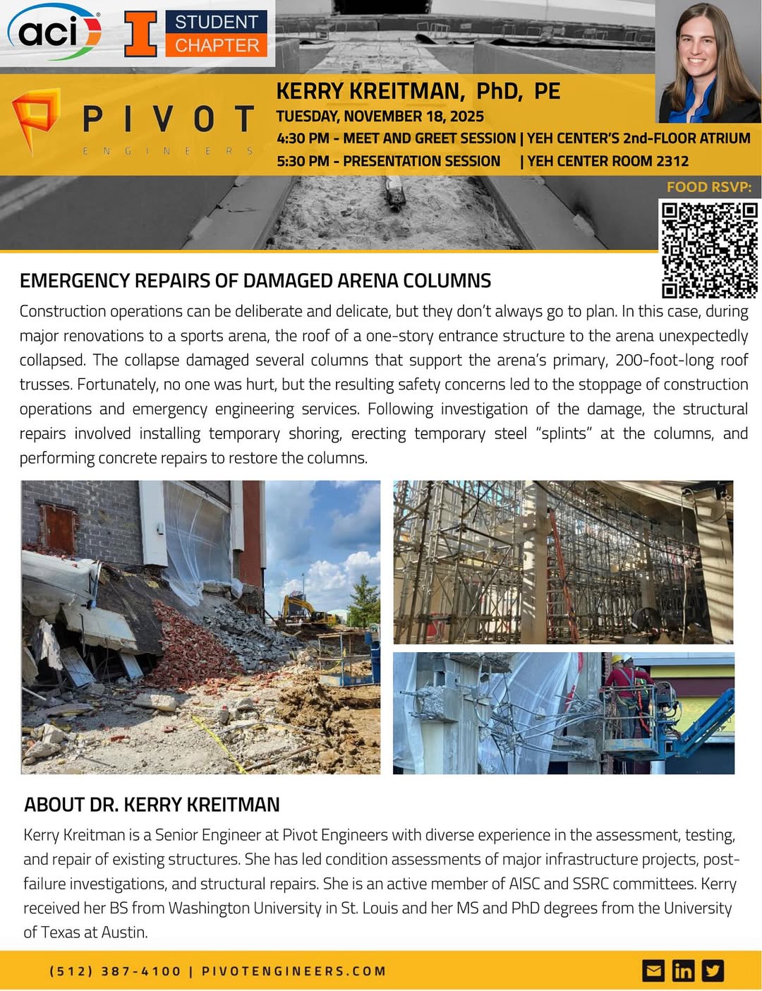 Emergency Repairs of Damaged Arena Columns Posted on November 30, 2025 by aky3@illinois.edu Date: Thursday, October 9thMeet and Greet Session: 4:30 PM – 5:15 PM.Presentation Time: 5:30 PM – 6:30 PM.Location: 2312 Yeh Student Center