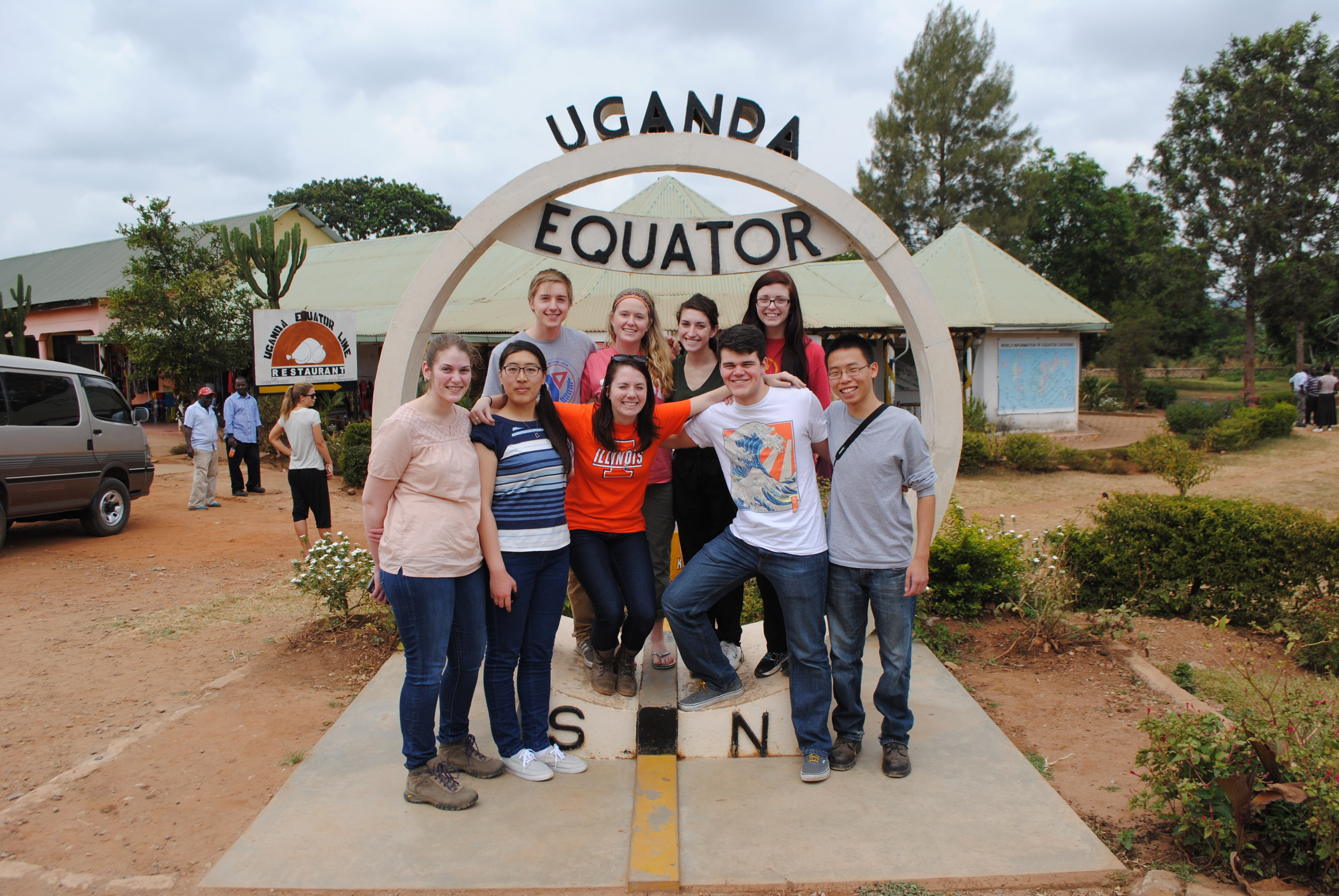 First stop, the equator. The student travel team poses for a photo together.