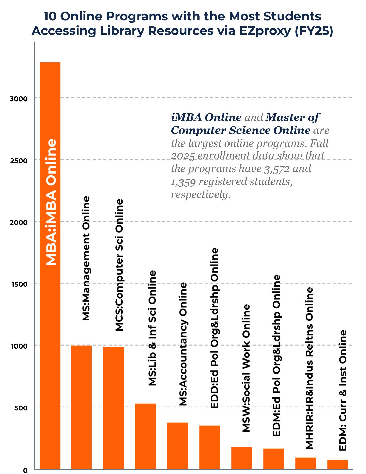 This graph shows the 10 online programs with the highest number of students accessing library electronic resources off-campus (based on EZproxy data) during fiscal year 2025 (July 2024–June 2025). There is a clear alignment between off-campus library resource usage and online program enrollment data. The data indicate that students in iMBA, Management, and Accountancy (Gies College of Business); Computer Science (Grainger College of Engineering); Library and Information Science (iSchool); and Education Policy, Organization & Leadership (doctoral and master’s programs), as well as Curriculum and Instruction (College of Education), comprised eight of the ten most frequent user groups of library resources via EZproxy.