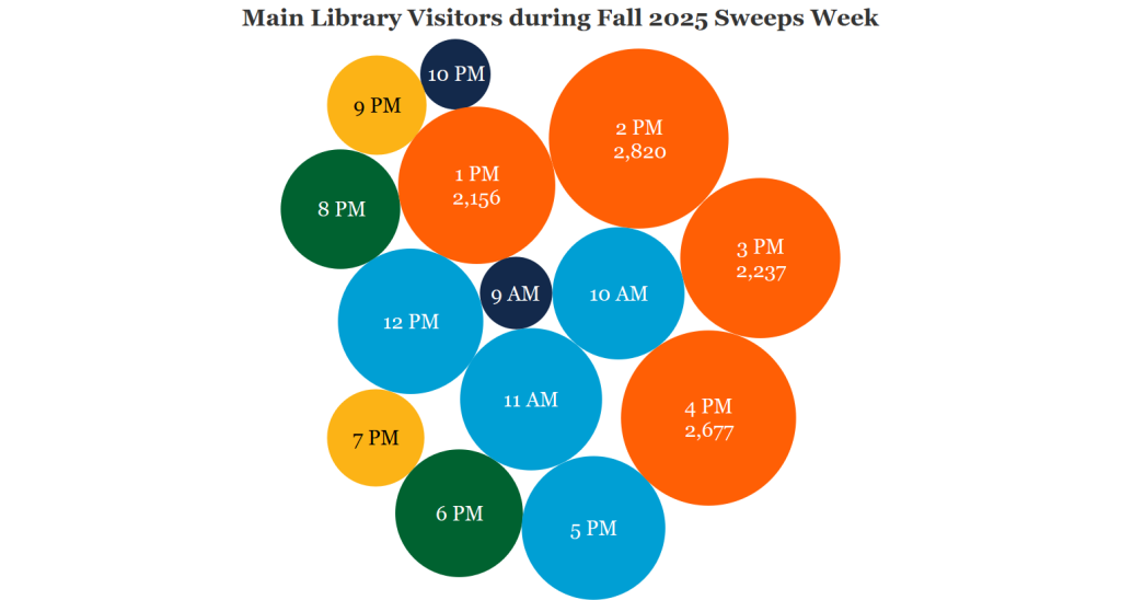 The Main Library is a hub of activity for students at all hours of the day. But which hours are the busiest? As part of Fall 2025 Sweeps Week (October 13–19, 2025), we collected Visitor Counts from Main Library Study Spaces (Social Sciences, Health and Education Library (SSHEL), The Orange Room, Shebik Family Reading Room, Central Access Services, Media Commons, Literature & Languages, History, Philosophy, & Newspaper, and Map Library) and found that students visit the Main Library at all hours. While visits peaked between 1 p.m. and 4 p.m., students continued to use the Main Library from the morning hours into the night.