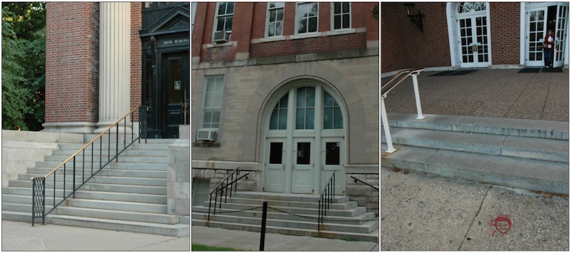 Other places where you may examine stairways of granodiorite include the north entrances of Smith Music Hall (above left), Natural History Building (middle), and the patio on the south side of the Illini Union.