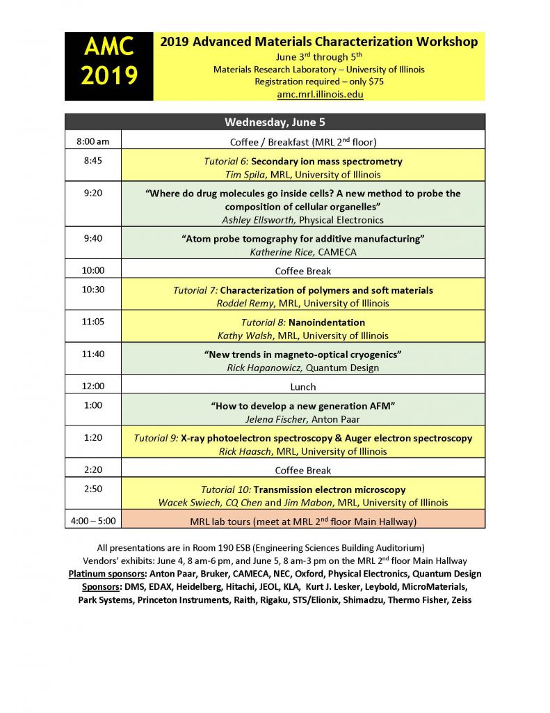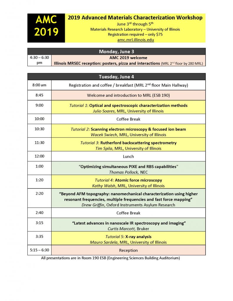 The workshop provides an overview and critical comparison of major analytical techniques for materials characterization (AFM, SEM, TEM, XRD, DSC, Raman, XPS, etc.) with emphasis on practical applications in Engineering and the Physical and Life Sciences. Presentations and instrument demonstrations span basic to advanced topics suitable for both novice and experienced scientists. Walk-through examples focus on problem-solving strategies, instrument resolution requirements, potential artifacts in data collection, and tips for data interpretation.