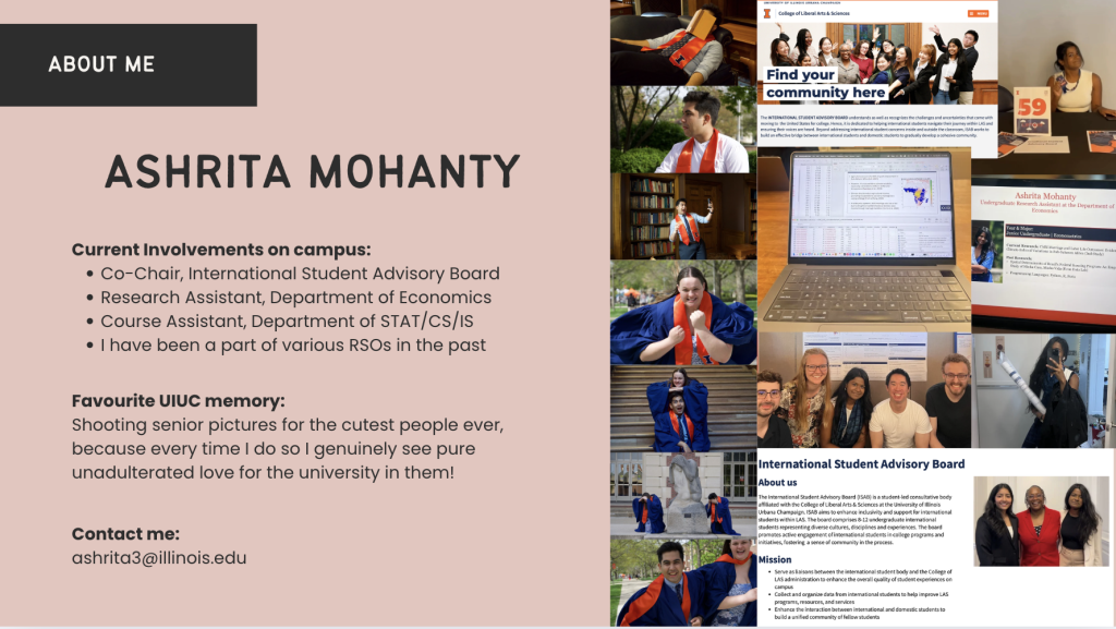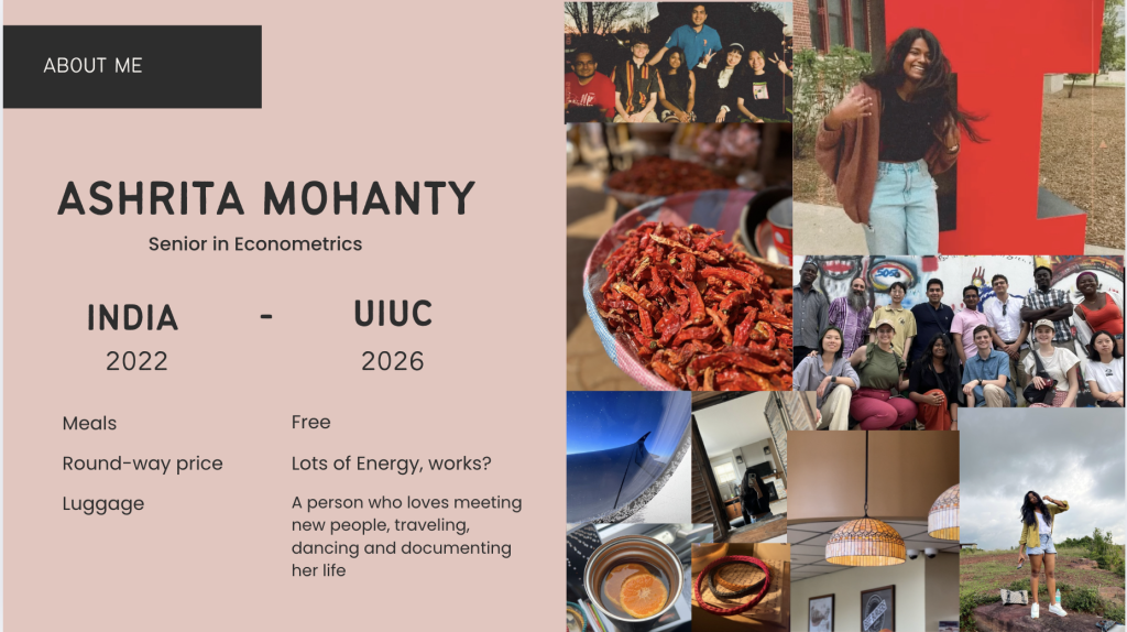 Hello, Hello, Hello! I’m Ashrita Mohanty, a passionate senior pursuing Econometrics and Quantitative Economics with minors in Statistics and Business at the University of Illinois at Urbana-Champaign. My academic journey has taken me from the vibrant culture of India in 2022 to the enriching halls of UIUC, where I’m set to graduate in May 2026.