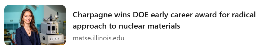 2025/03/26: Marie received the TMS Early Career Faculty Fellow award. This is one of three U.Illinois awards, as collaborators Prof. Robert Maass and Prof. Janelle Wharry each received the Brimacombe medal for their respective exceptional scientific achievements in the fields of irradiation effects and localized plasticity! We are honored and proud to collaborate with you both.