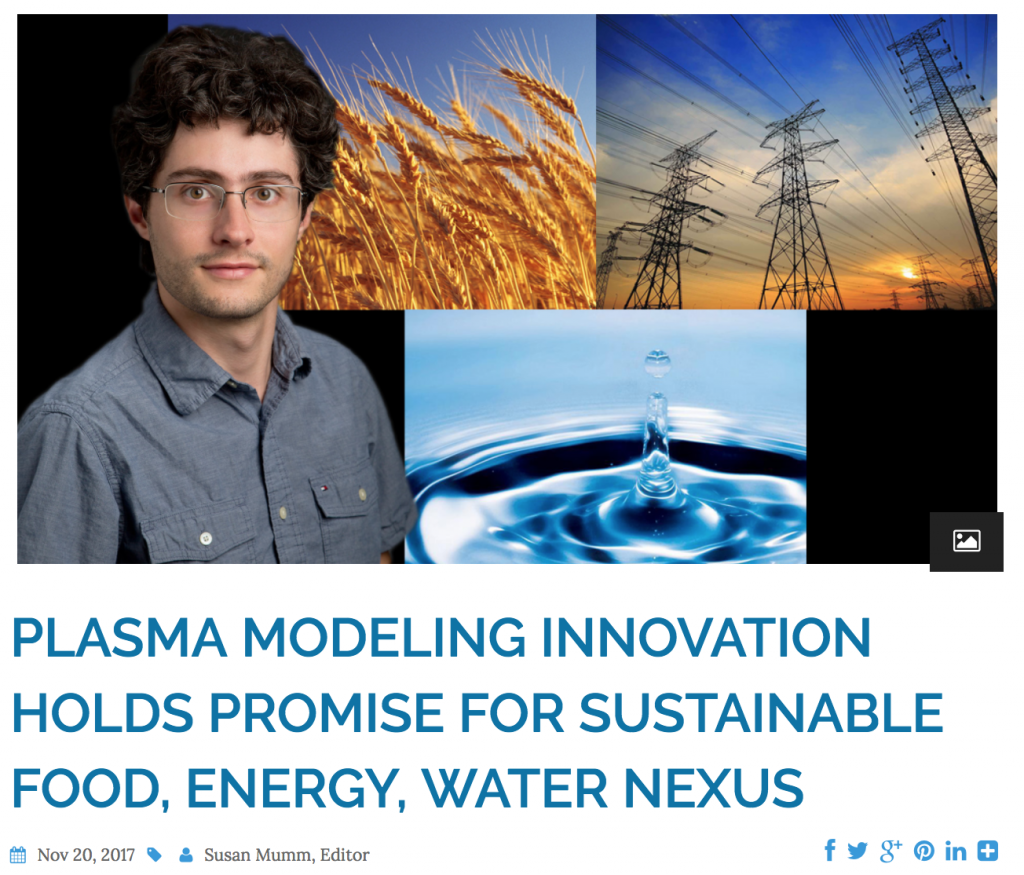 NSF-SI2 Press Release Posted on November 20, 2017November 22, 2017 by dcurreli@illinois.edu Plasma modeling innovation holds promise for sustainable food, energy, water nexus https://npre.illinois.edu/news/plasma-modeling-innovation-holds-promise-sustainable-food-energy-water-nexus
