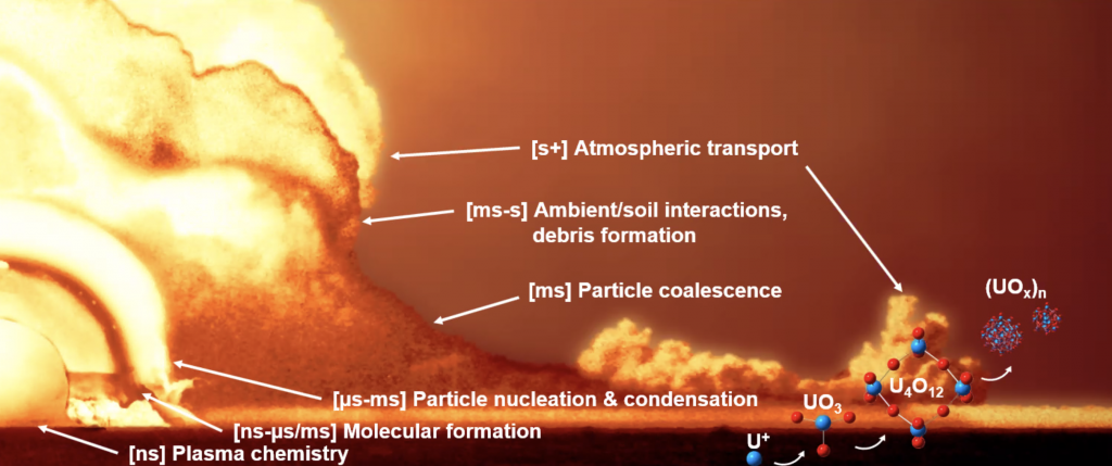 ABSTRACT: Current understanding of metallic chemistry in extreme environments, such as nuclear fireballs, remains limited due to the multitude of physical processes and timescales involved. In particular, many chemical and plasma chemical reaction pathways responsible for forming uranium molecular species remain either unknown or unverified. In recent years, this longstanding knowledge gap has been the target of an increasing number of experimental characterizations, which this work aims to leverage to produce an updated model of uranium oxide (UOx) formation in extreme environments.