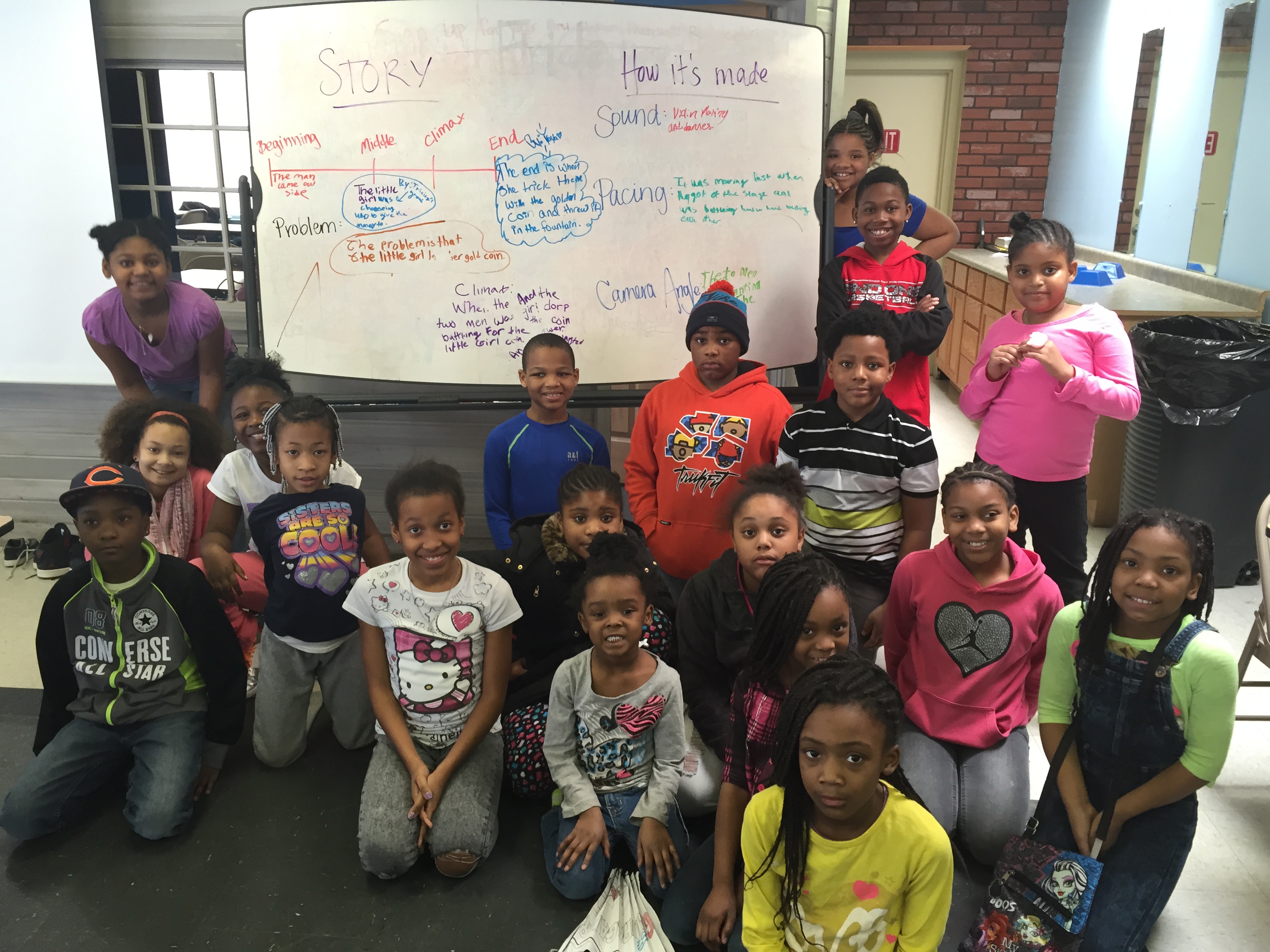 The next group we worked with was our 3-5th graders. The workshop ran similar to K-2, but instead we watched Egyptian Pyramids and One Man Band. Both of these were a little longer films and had some more complicated storytelling elements. While watching One Man Band, we split the groups up and each group was assigned two different elements to discuss in small groups. We had the groups write up their observations on the whiteboard before our final discussion. We snapped one photo before it was time for lunch!