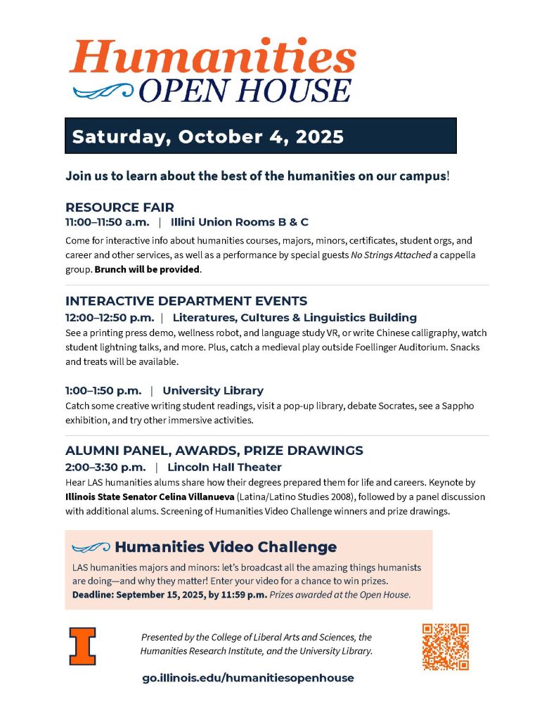 If you’d like to participate in the video challenge associated with this event you must be an actively enrolled University of Illinois undergraduate in FA25 with a declared LAS humanities major or minor. First Prize will receive $500; Second Prize, $250; and Third Prize, $125, deposited to the winner’s student account. The deadline for the competition is September 15. Click here to learn more.