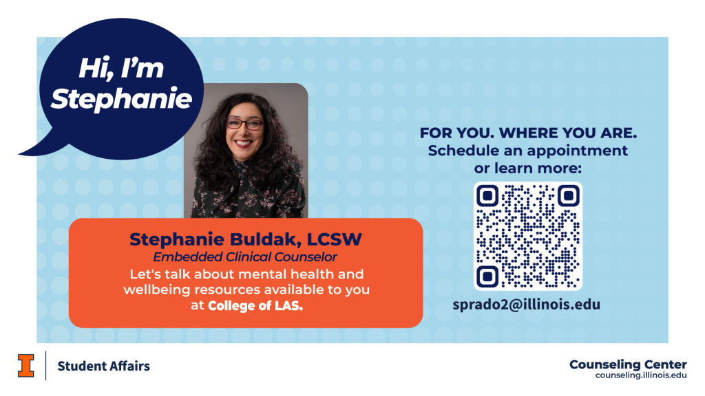 Stephanie Buldak is an embedded clinical counselor that primarily offers counseling services to students within the College of LAS. Our LAS embedded counselor provides a safe and welcoming space where you can talk openly about whatever challenges you are facing. Whether you are struggling with stress, anxiety, motivation, or adjusting to college life, Stephanie is here to listen and help you find healthy ways to cope.