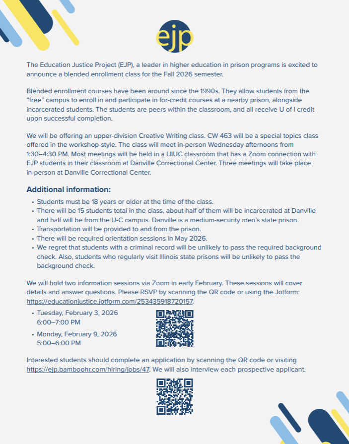 Winners will be announced in early April. Please direct any questions to John Dudek, Associate Director of Creative Writing at jdudek4@illinois.edu.