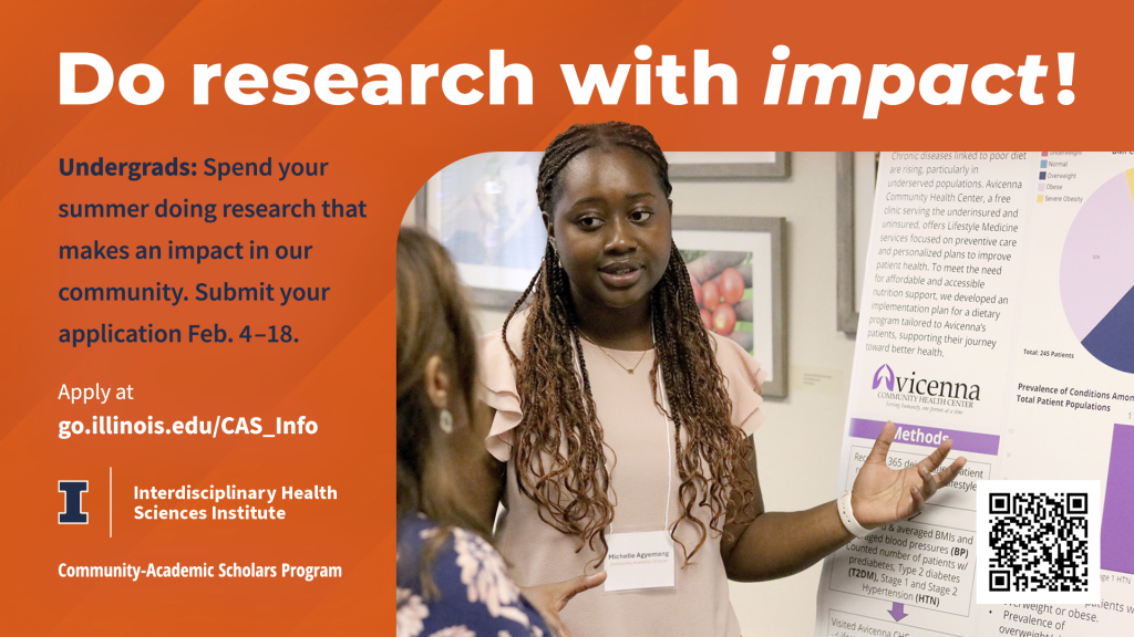 The Community-Academic Scholars (CAS) program is a 10-week summer research experience that empowers undergraduates in all majors to address critical issues in the local community. Scholars work with an Illinois researcher and a community organization on a research project designed to directly benefit the community members served by the partner organization. Review the project descriptions and the scholar’s role within each project to find projects that best match your strengths and background. Apply by Feb. 18.