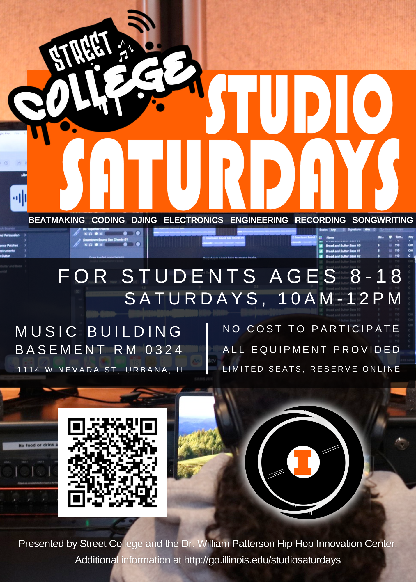 Street College: Studio Saturdays is a free youth program for students ages 8-18. The program is presented in partnership by the nonprofit organization, Street College and the Hip Hop Innovation Center at the University of Illinois.