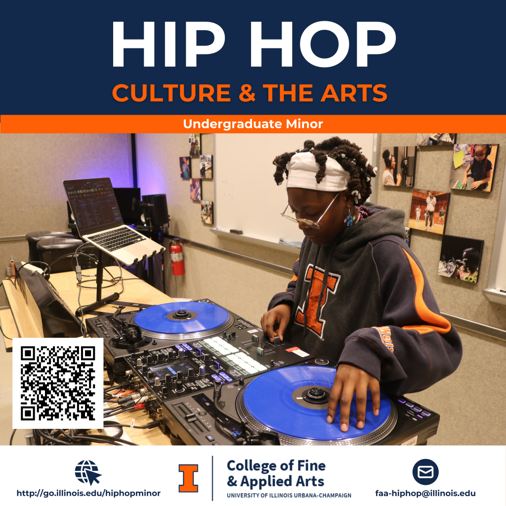 The Undergraduate Minor in Hip Hop Culture and the Arts is an interdisciplinary program housed in the College of Fine Applied Arts. Students completing this program will explore fundamental content in Hip Hop history, generate original creative work, engage with critical cultural considerations, develop introductory skills with relevant digital media, and participate in youth programming in the Champaign-Urbana community.