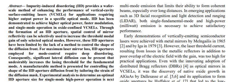 The Advanced Semiconductor Device and Integration Group is proud to share a recent publication by Patrick Su, Fu-Chen (Alex) Hsiao, Tommy O’Brien and Professor Dallesasse on demonstrating a novel method of controlling impurity-induce disordering apertures via Mask Strain that can be applied to wafer-scale manufacturing of high-power single-mode VCSELs.