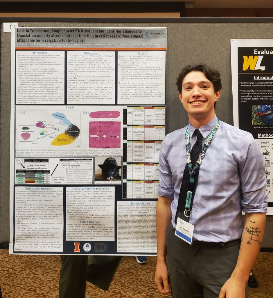 PhD candidate Joe Bielanski attended the 9th Conference of the International Society of Wildlife Endocrinology in St Louis, MO, presenting his poster ‘Lost in Translation: single nuclei RNA sequencing identifies changes to translation underly altered adrenal function in red foxes (Vulpes vulpes) after long-term selection for behavior.’. He also took in 3 days of thought-provoking talks regarding noninvasive hormone measurement techniques for biomarkers of stress/reproduction/health in non-model organisms, and aims to try several new techniques with our foxes!