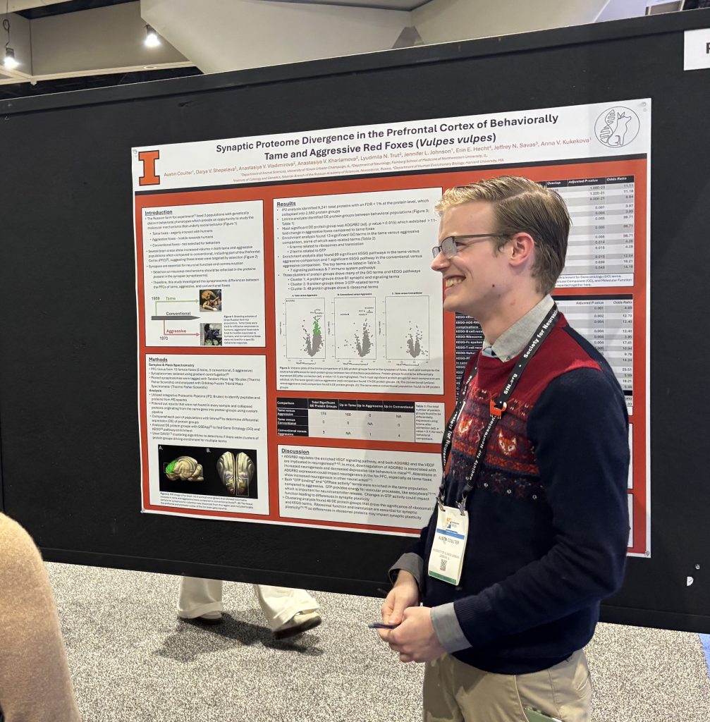 Austin went to the 5 day Society of Neuroscience Conference in San Diego, California. He attended the conference with over 20,000 other people, and presented his poster “Synaptic Proteome Divergence in the Prefrontal Cortex of Behaviorally Tame and Aggressive Red Foxes (Vulpes vulpes).”