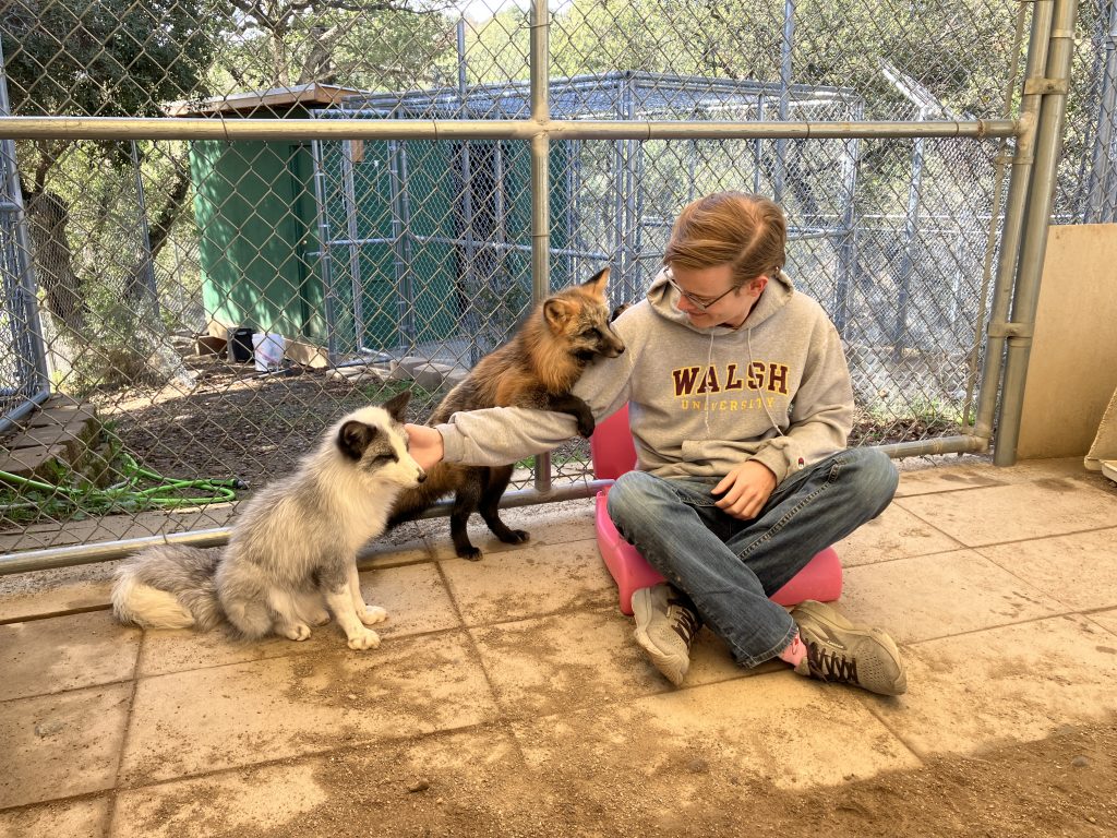 In late November, Dr. Kukekova and PhD candidates Austin Coulter and Joe Bielanski visited the Judith A Bassett Canid Education and Conservation Center in Santa Ysabel, CA, for the incredible opportunity to work with the only population of Novosibirsk experimental tame-bred foxes that reside in the United States. Austin and Joe set up and ran 5 days of behavioral tests on both experimental and fur-farm rescue foxes, as part of a larger ongoing project to evaluate the impacts of breeding for tame behavior towards humans on cognition and problem-solving skills. Lab members also got to spend plenty of quality time with the foxes and had the unique opportunity to interact with these amazing animals. Massive thanks to our friends Amy and Dave Bassett, and Melissa Dixon for hosting us, helping us set up experiments, and for giving us this unique opportunity. Consider visiting JABCECC if you want to experience how wonderful the experimental tame bred foxes are.