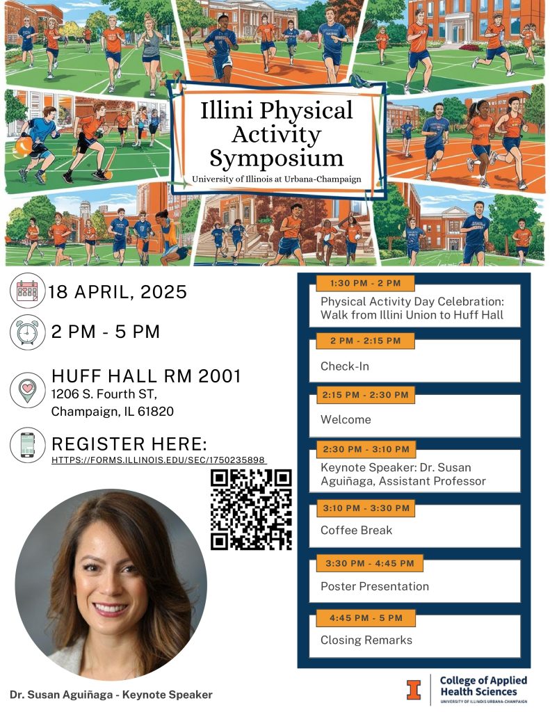 This is the first edition of the Illini Physical Activity Symposium organized by the IPA Initiative to celebrate International Physical Activity Day. This event joins researchers, faculty, and students to discuss their interests with physical activity by including a keynote speaker (Dr. Susan Aguiñaga), abstract presentations to showcase current research, and a chance to discuss these topics.