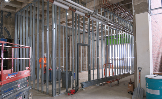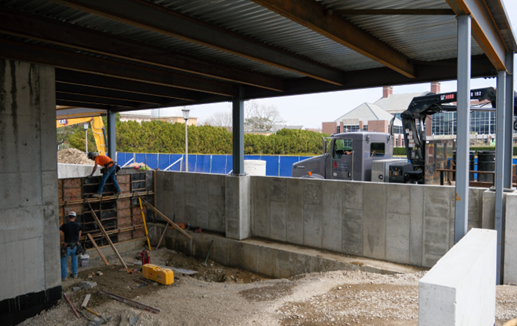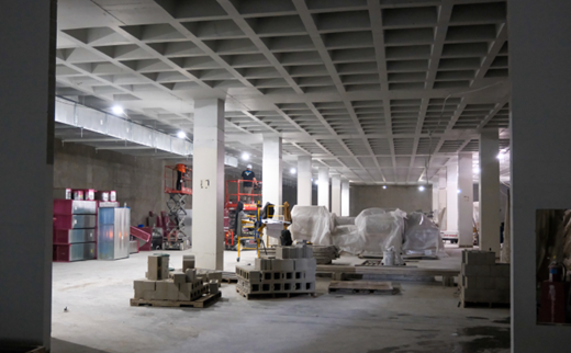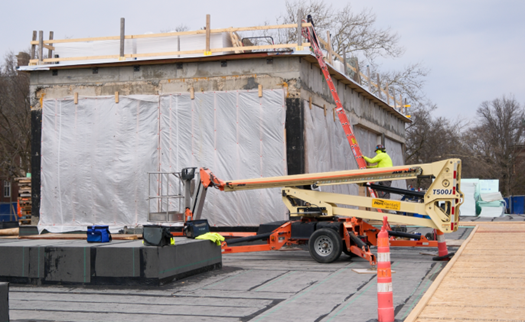 Construction continues apace, with our most recent site observation from the architect estimating that the project is 32% completed. As of March 26th, the following work was in progress: Installation of hot fluid applied waterproofing at plaza ongoing. Wood walkway installed to west pavilion doors to protect waterproofing; upper-level wall framing ongoing and one side of walls being topped out with GWB; wall framing and door frames being installed at upper-level west corridor; MEP rough-ins ongoing throughout; ductwork being installed throughout upper level; lower-level plumbing work (below slab) ongoing; conduit installation at lower-level progressing; drilling for new east elevator piston; roof work started on west pavilion; site cleanup and rough grading ongoing; CMU installation at east elevator area, upper level.