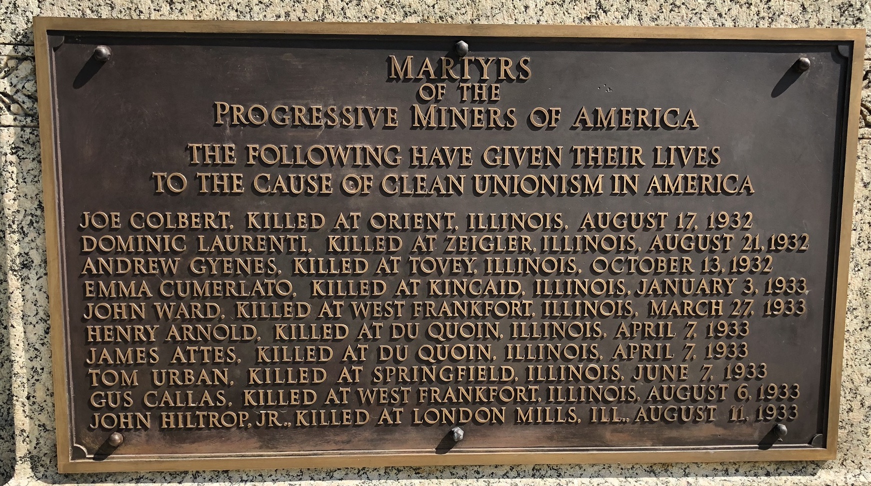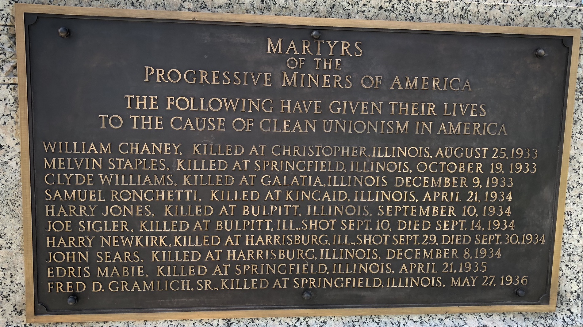 The violence arose as a result of the creation of the Progressive Miners of America and their split from the United Mine Workers of America. It resulted in at least 20 murders around the state and 55 bombings with Taylorville’s beautiful Courthouse Square being the venue of a particularly dramatic shootout. Historic newspapers displayed at the Christian County Coal Museum in Taylorville give a sense of the era as do the plaques around the base of the Mother Jones Monument in the Union Miners Cemetery, Mt. Olive, which list the PMA martyrs.