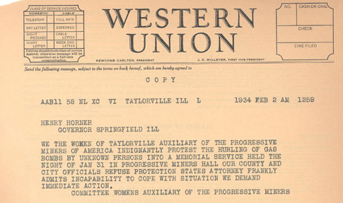 The Women’s Auxiliary of the PMA was created at the inception of the breakaway union and was active during the violence. The telegram below is particularly revealing of their role in the PMA. It is dated February 2, 1934 and complains about the UMWA violence directed at the PMA, in this instance during a memorial service.