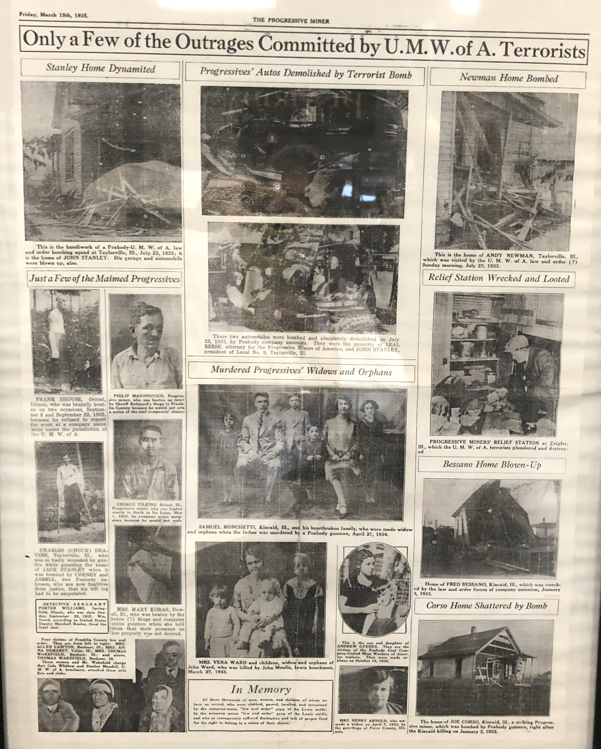 As explained by the Office of the Illinois Secretary of State on the basis of documents held in the Illinois State Archive: “John L. Lewis … had worked out an agreement with the Peabody Coal Company whereby United Workers only would work the company’s mines in Christian County. They were to be paid a reduced wage of five dollars a day. The Progressive Miners, who demanded local autonomy and a higher wage, were squeezed out and left to subsist on the produce from their backyard gardens. Although Governor Horner had some sympathies for the Progressive Miners his hands largely were tied. Lewis was able to forge strong ties with the Roosevelt [U.S. President] administration and as time passed the Progressive Miners increasingly [were seen as] political liabilities. The National Guard was called up for months on end to occupy Taylorville in particular and thereby prevent pitched gun battles.”