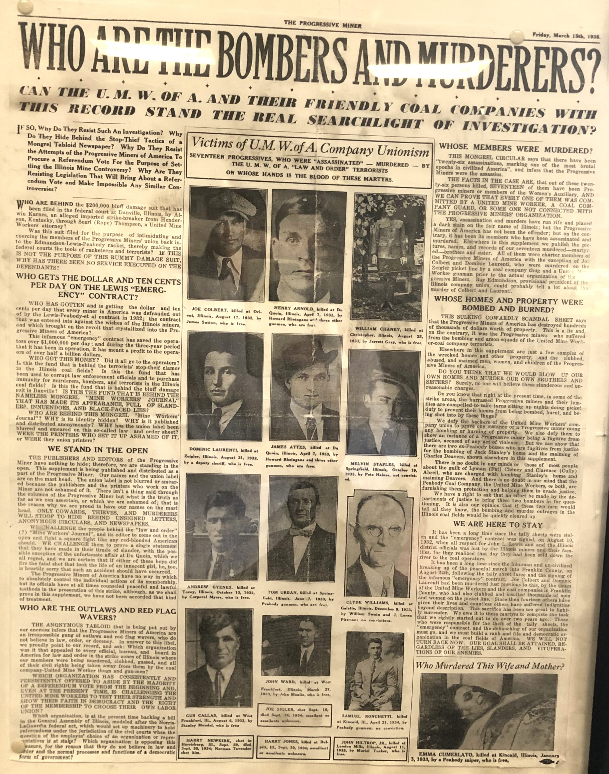 The PMA believed that the UMWA was “in bed with” the coal operators to the detriment of union contracts for the miners. They also objected to the autocratic management style of UMWA President John L. Lewis, indeed labeling him corrupt. The Illinois miners were particularly aggrieved at their perceived denigration and disenfranchisement by Lewis. The issues came to a head with a vote concerning a new national contract for miners (bear in mind that this was happening during the Great Depression) that many Illinois miners believed to have been falsified.
