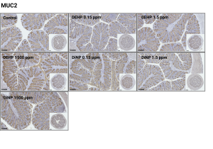 Figure 1: Immunohistochemistry in mouse colon tissue exposed to corn oil (control), DEHP, or DiNP for mucus production.