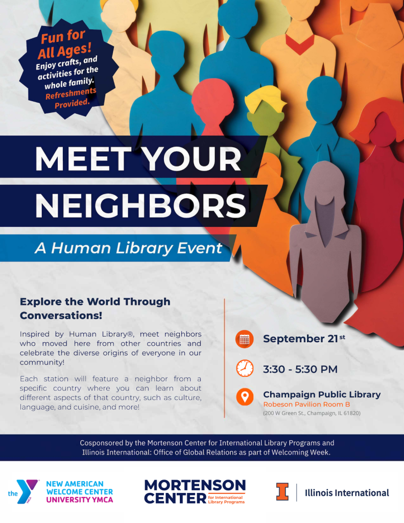 The Mortenson Center, in collaboration with the New American Welcome Center, and Illinois International- Global Relations will have a Human Library Event as part of the events featured during 2025 National Welcoming week. The event will feature immigrants and international students living in Champaign-Urbana as human books. Each human “book” will be available during the event to interact with “readers” and talk to them about their native country. Topics covered in the conversations include among others geographic location, cuisine, languages spoken and culture. Snacks, arts & crafts will be offered as part of the event. Open to all ages!
