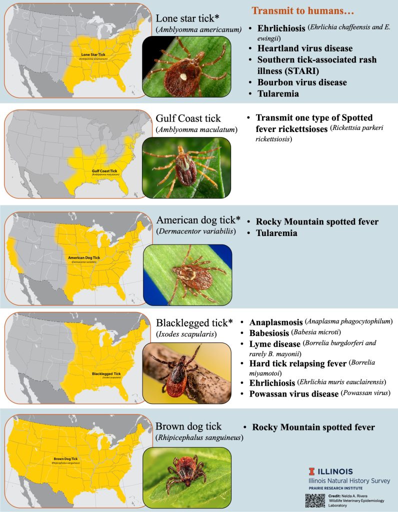 Distribution of five ticks of human and veterinary importance in the U.S. and the infectious diseases that they may transmit to humans. An * indicates the species of ticks that are considered the main vectors of tick-borne diseases in Illinois.
