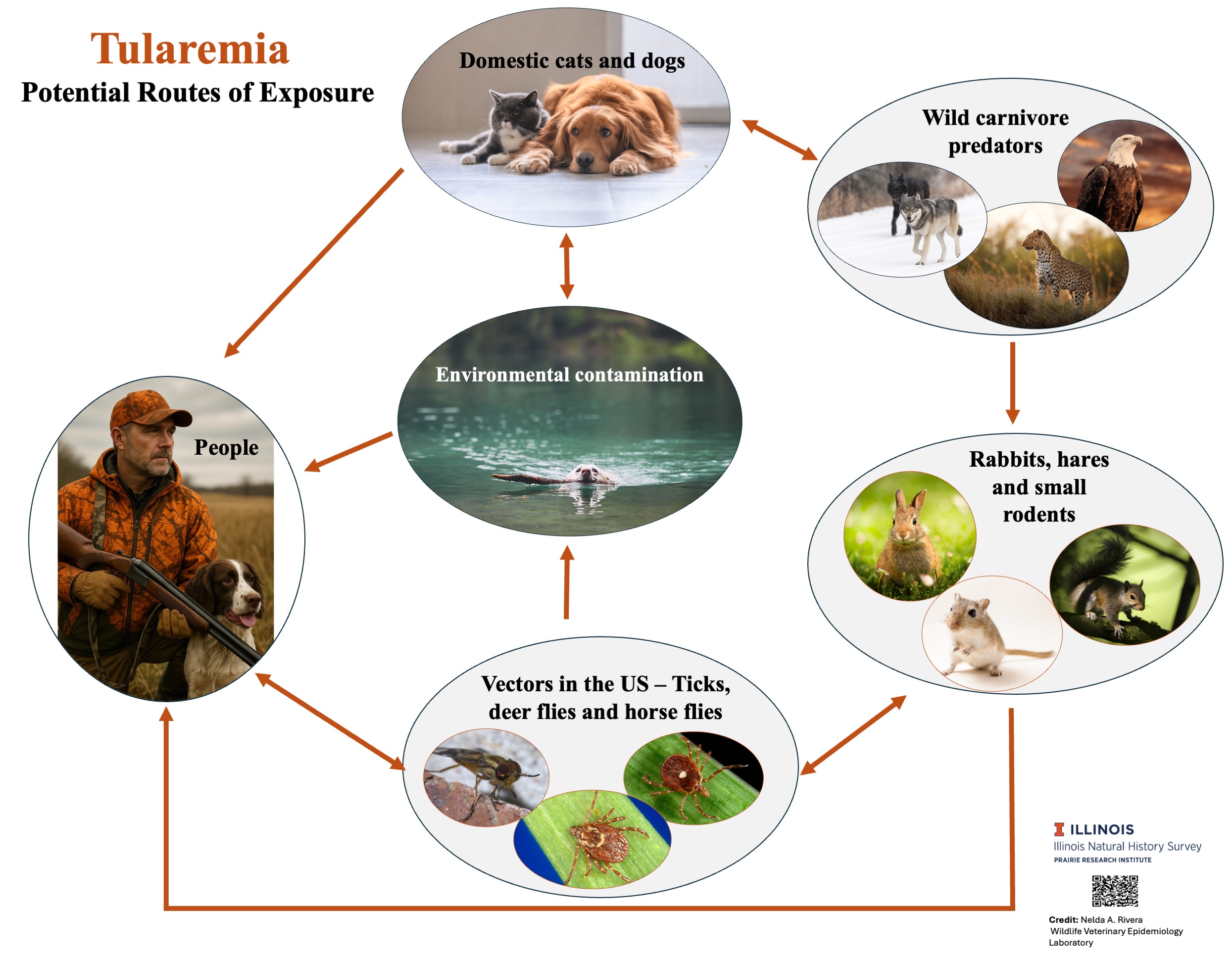 Credit: Nelda A. Rivera, Wildlife Veterinary Epidemiology Laboratory, Illinois Natural History Survey, University of Illinois at Urbana-Champaign. “Tularemia: Potential Routes of Exposure” [JPEG]. Deer fly photo by xpda; Lone star tick and American dog tick photos from CDC. Cycle adapted from Sharma et al., 2023.